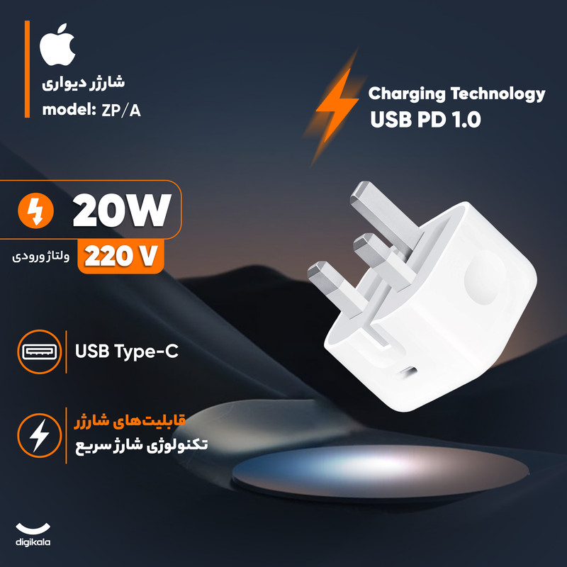توان خروجی در این مدل از شارژرهای دیواری «اپل» 20 وات است. همچنین جریان خروجی در آن 3.0 آمپر شدت دارد و برای شارژ باتری انواع گوشیهای موبایل، دوربین دیجیتال و دیگر لوازم از این قبیل مناسب خواهد بود. در این شارژر دیواری یک سه شاخه برق قرار گرفته که از آن برای اتصال شارژر به پریز برق استفاده میشود. البته توجه داشته باشید که این سه شاخه با پریز برق در ایران سازگاری ندارد و شما برای استفاده از آن باید از یک تبدیل 3 به 2 استفاده کنید. پس از استفاده از این تبدیل، شما میتوانید شارژر را بهطور مستقیم به پریز برق متصل کرده و دستگاه مورد نظر خود را با کمک یک کابل USB به آن متصل کنید. ولتاژ ورودی در این شارژر 220 تا 240 ولت و ولتاژ خروجی در آن 20 ولت است. وزن این شارژر 80 گرم بوده و ابعاد آن بهصورتی طراحی شده که بهسادگی قابل حمل باشد.