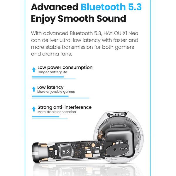 هندزفری هایلو X1 Neo دارای بلوتوث نسخه 5.3 است. با استفاده از این هندزفری می توان تا فاصله ده متری (بدون هیچ مانعی) بدون افت کیفیت به موسیقی گوش داد. از دیگر قابلیتهای بلوتوث نسخه 5.3 اتصال پایدارتر است.